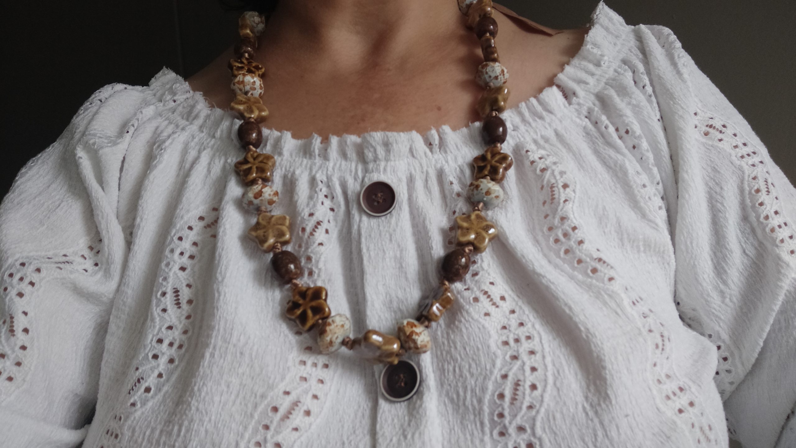 Joli collier en pierres vernies. La hauteur est de 30 à 35 cm, ajustable grâce à son ruban décoratif. Il est léger à porter et ne pèse que 68 g.