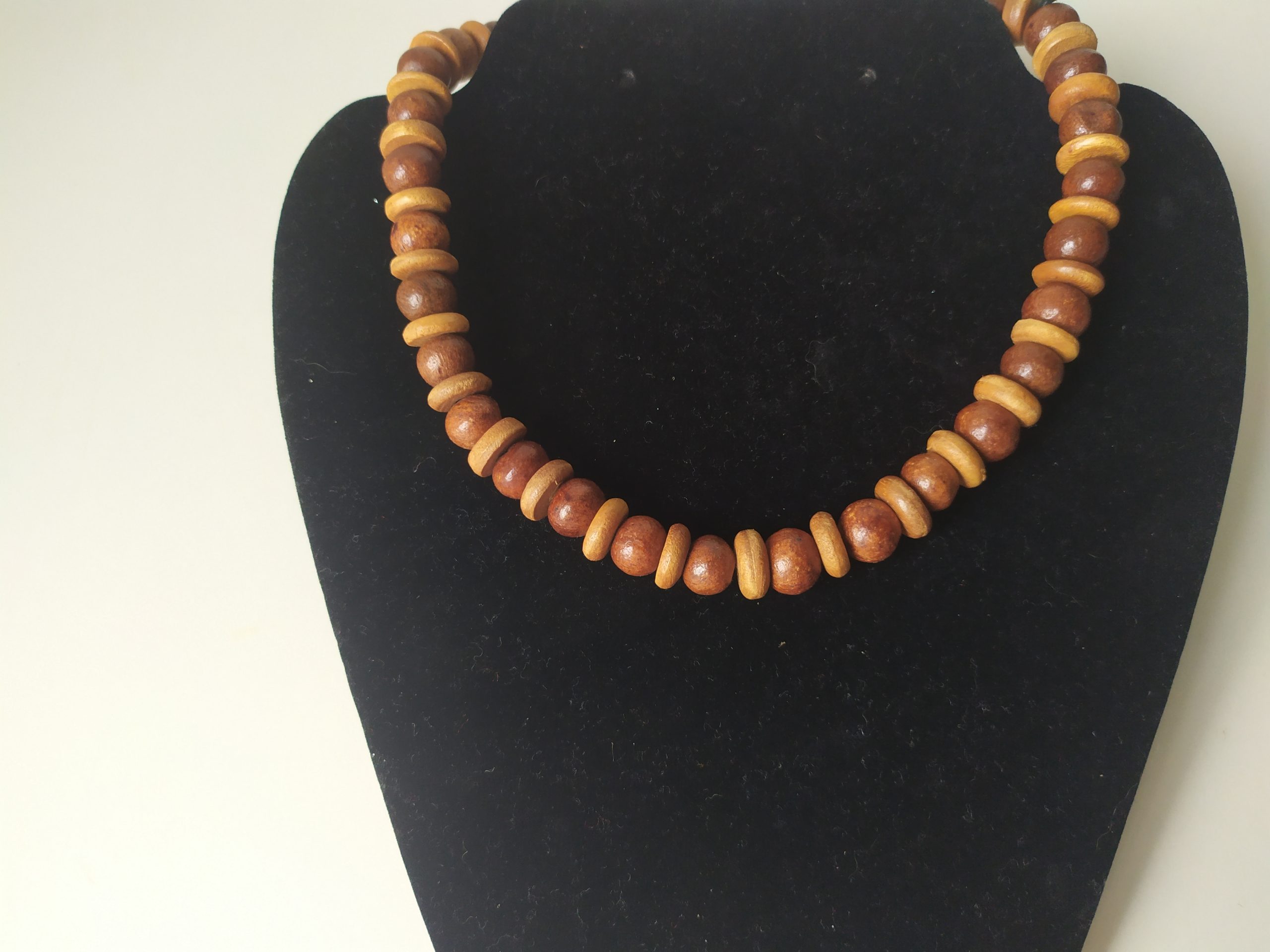 Collier ras de cou en perles de bois. Léger à porter, il ne pèse que 23 g. Son diamètre est d’environ 13 cm.