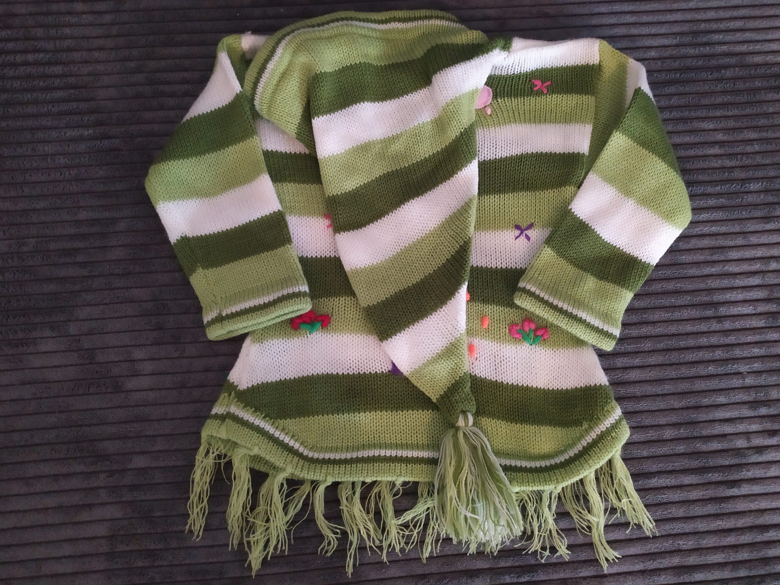 Joli pull péruvien à capuche lutin agrémenté d’un pompon assorti. Tricoté par des artisans locaux, ce pull original possède des franges au bas , et des petits objets en feutrine. Pour fille de – à 12 mois.