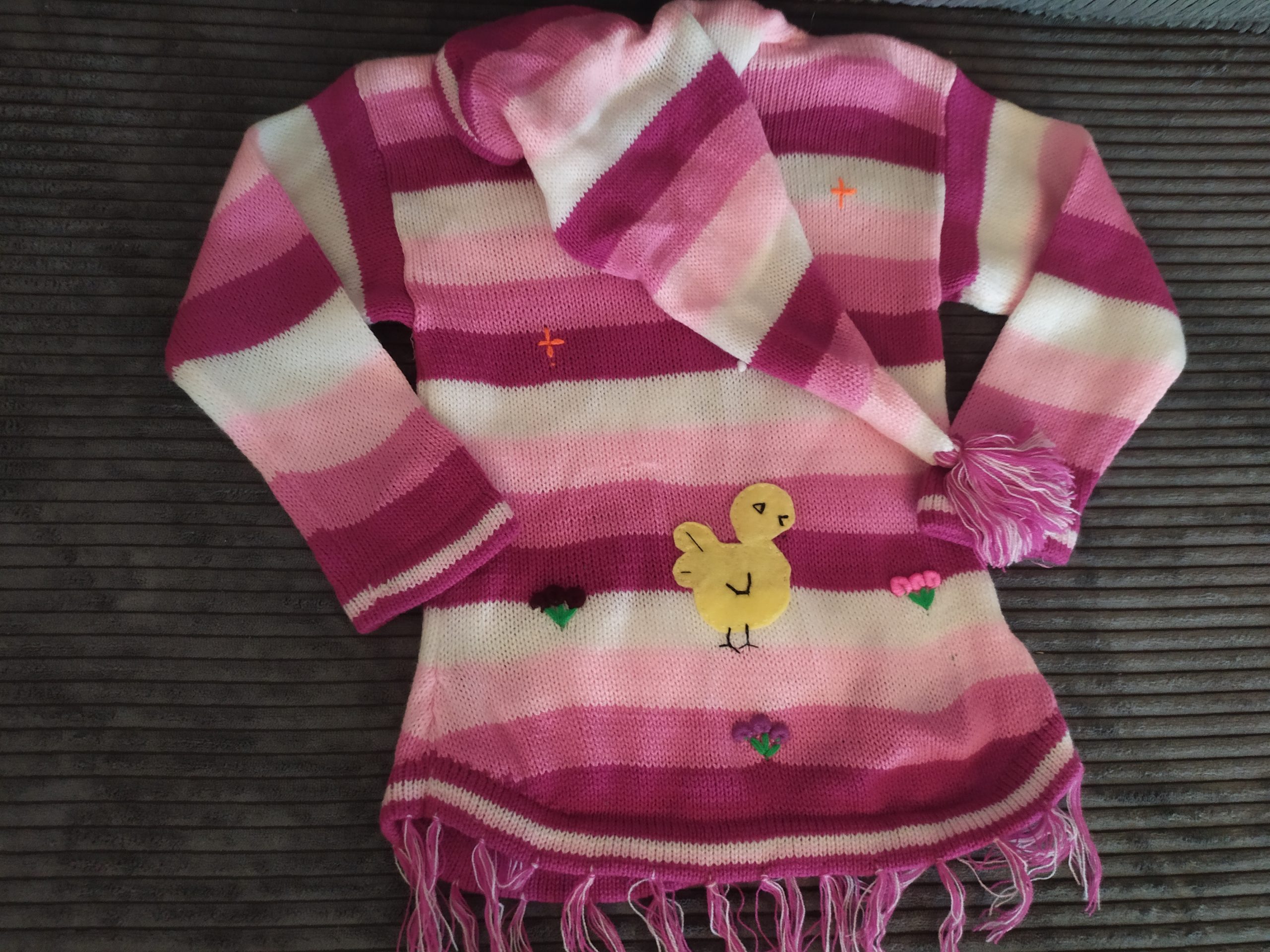 Joli pull péruvien à capuche lutin agrémenté d’un pompon assorti. Tricoté par des artisans locaux, ce pull original possède des franges au bas , et des petits objets décoratifs en feutrine. Pour fille de 4 ans.